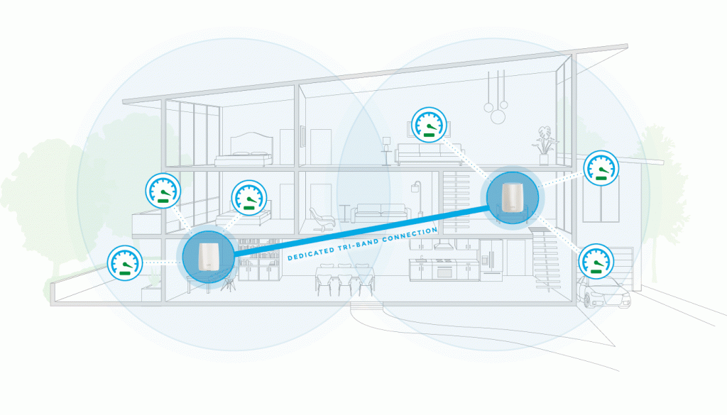 Sometimes getting a network WiFi signal from one side of your home or office to another can be challenging. Thankfully, some great companies like Orbi have developed what are called “mesh networks”. As shown in the diagram below, the main WiFi signal is sent to a second Wifi repeater through a “dedicated channel.” The second wifi access point then re-broadcasts the signal thus allowing devices far from the main router to access the internet. A third and even fourth device can be used to distribute the signal evenly through a large structure.